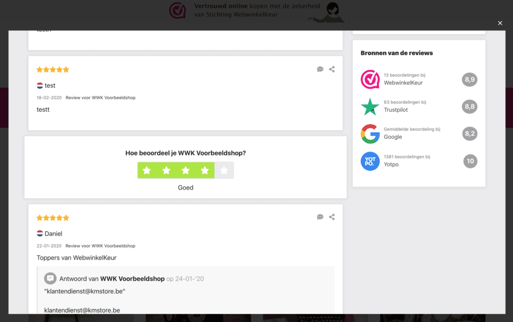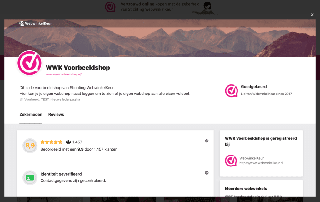 Een geldig keurmerk van WebwinkelKeur is daarnaast vaak klikbaar. Na het klikken komt er een pop-up naar voren waarin onder andere de zekerheden en badges & reviews te lezen zijn.