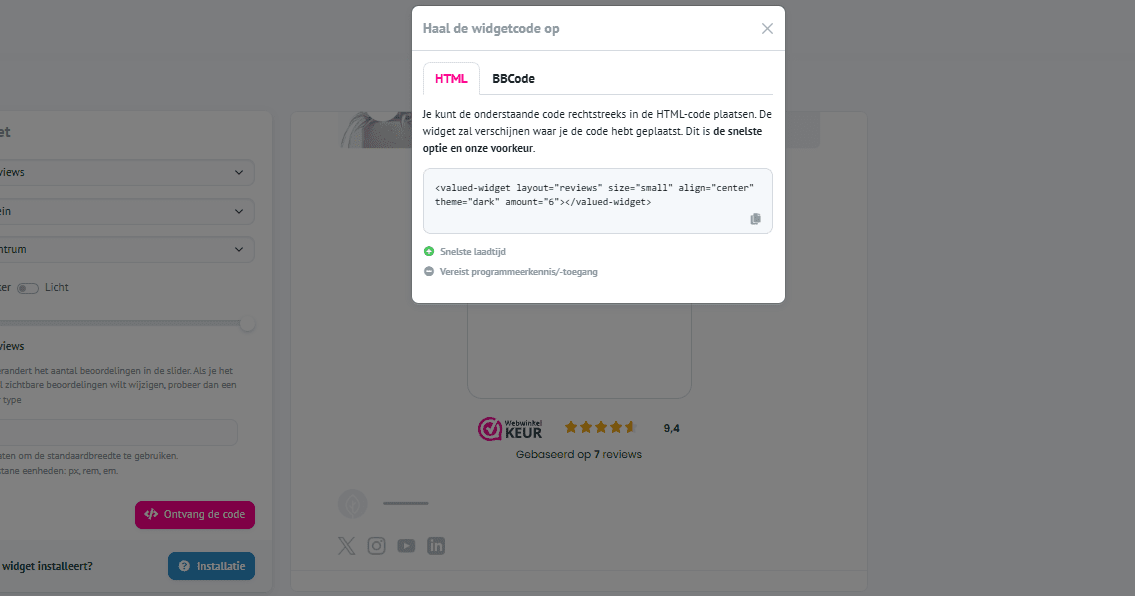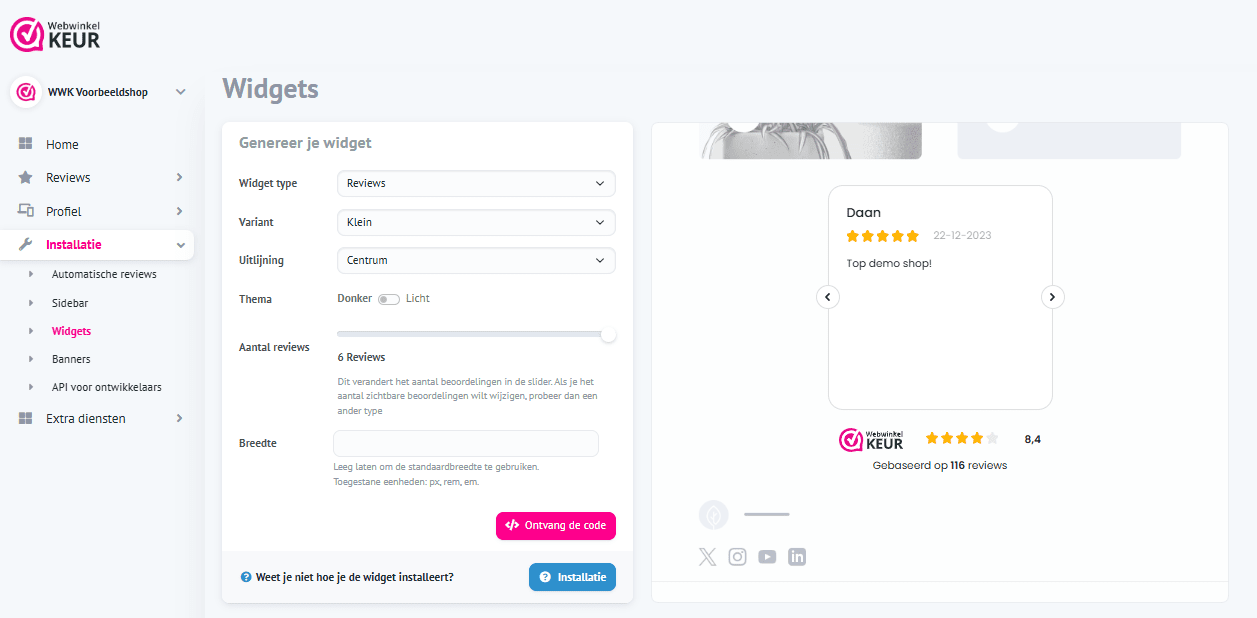 - Login binnen je WebwinkelKeur dashboard en ga naar 'Installatie' > 'Widgets'.