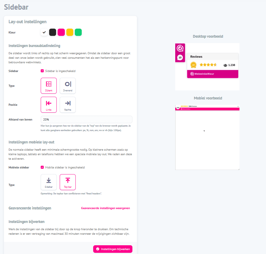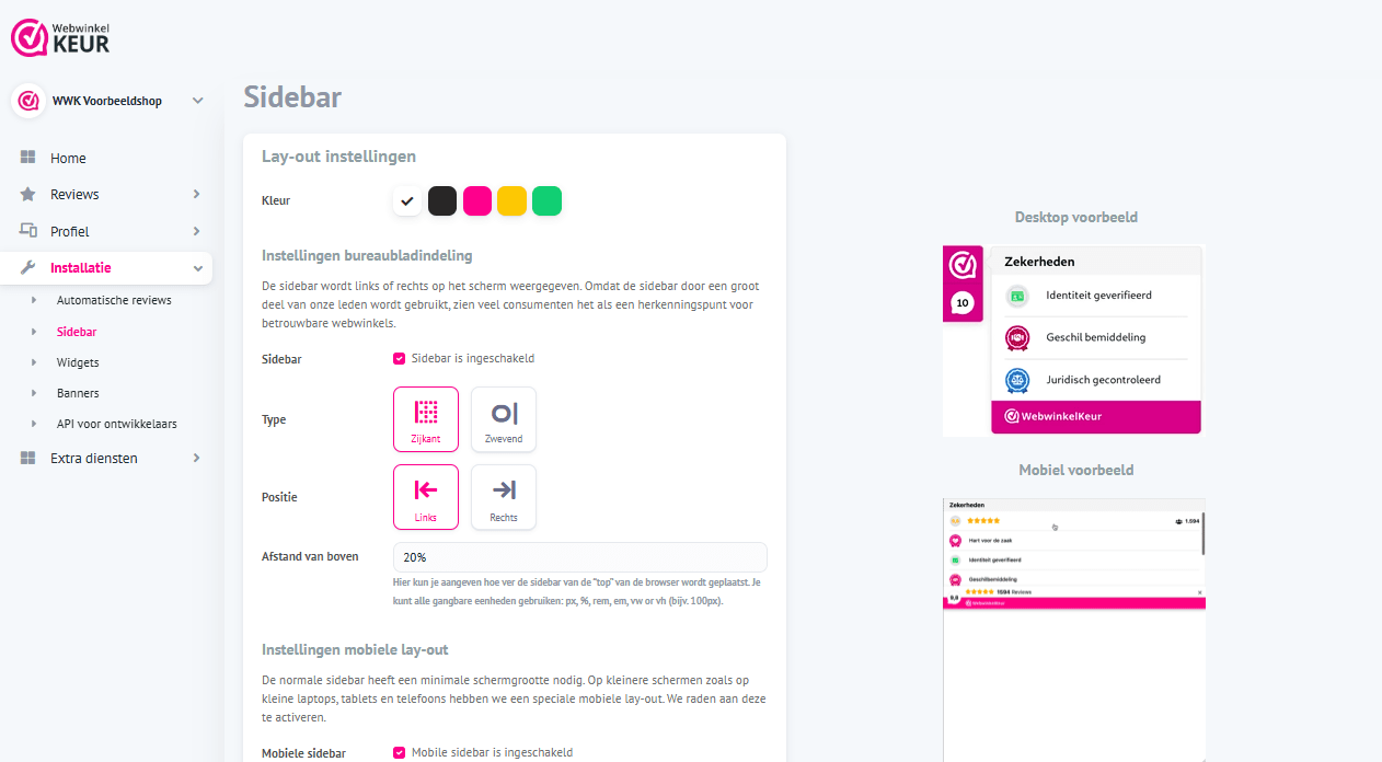 De sidebar moet nu geïnstalleerd zijn en zichtbaar in de frontend van je webshop. Verdere instellingen vind je terug binnen het dashboard van WebwinkelKeur. Let op: aanpassingen die je daar uitvoert kunnen wat langer duren voordat ze zichtbaar zijn in je webwinkel.