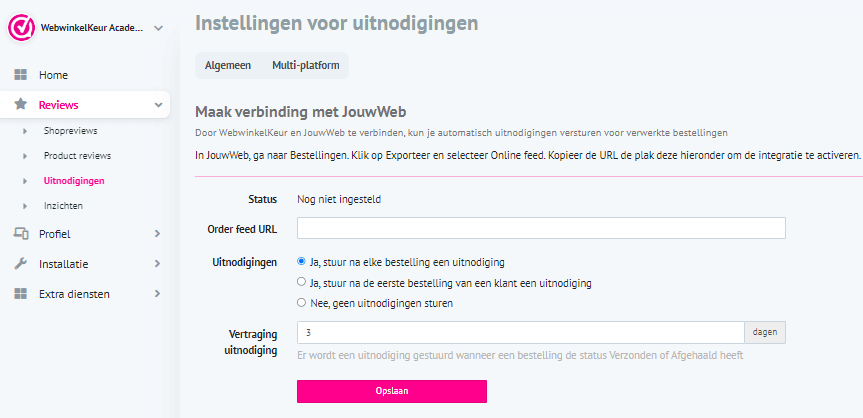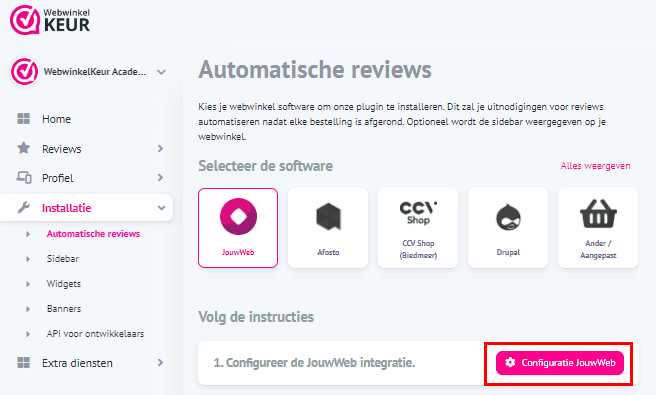 - Log in op je WebwinkelKeur dashboard, klik op 'Installatie' > 'Automatische reviews' > selecteer 'JouwWeb' als software > klik vervolgens op de knop 'Configuratie JouwWeb'.
