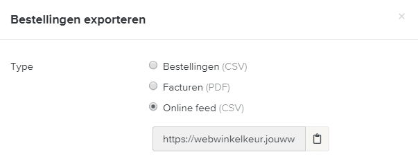 - Selecteer de optie 'Online Feed (csv)' en kopieer de link die eronder verschijnt.