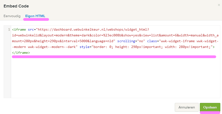- Klik op 'Embed aanpassen', ga naar het tabblad 'Eigen HTML' en plak daar de code. Klik vervolgens op 'Opslaan'.