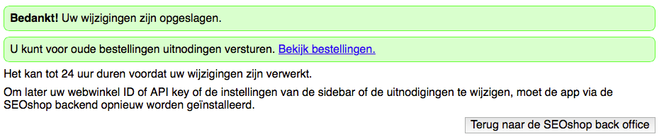 8. Klik op Opslaan. De App is nu actief. Optioneel kun je na het 'Opslaan' van de instellingen op 'Bekijk bestellingen' klikken. Zo heb je de mogelijkheid om vroegere klanten direct een uitnodiging te versturen.
