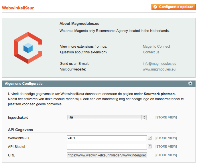 9. Vul hier je Webwinkel-ID en API sleutel in. Deze vind je in het WebwinkelKeur dashboard onder 'Installatie' > 'Selecteer software' > 'Magento'.