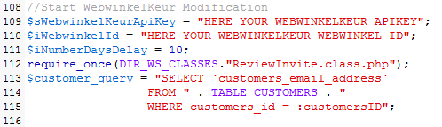 - Open het bestand includes/modules/pages/checkout_success/header_php.php en pas rond regel 108 de configuratie aan met jouw persoonlijke WebwinkelKeur ID en API key. Deze gegevens vind je onder 'Keurmerk plaatsen' na inloggen op je WebwinkelKeur account.