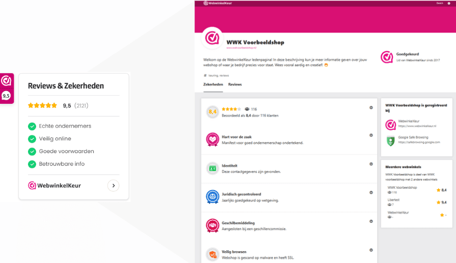 Zoals hierboven vermeld staat, krijgen leden van WebwinkelKeur een geheel eigen ledenpagina. Niet alleen verwijzen de uitingen die je op de webshop hebt staan naar deze pagina, ook Google navigeert de consument hiernaartoe. Wanneer de consument jouw webshopnaam googelt in combinatie met bijvoorbeeld betrouwbaarheid, reviews en/of keurmerk, komen ze op jouw persoonlijke pagina terecht. Deze pagina bevat onder andere reviews, bedrijfsgegevens en zekerheidsbadges. Door reviews te verzamelen, verschillende badges te verdienen en je pagina te personaliseren, onderscheid je je webshop nog meer van de rest! De URL van zo'n pagina kun je herkennen aan: https://www.webwinkelkeur.nl/webshop/[webshopnaam]_[getallen]. Een voorbeeld van een dergelijke ledenpagina kun je hier vinden