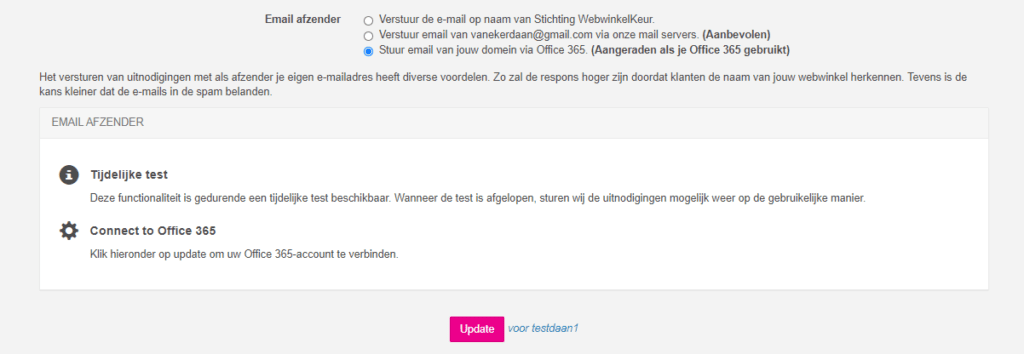 Help ons testen!: Gebruik je Office365? Autoriseer ons dan om e-mails te verzenden vanuit jouw Office365 client. Wie weet heeft dit een enorm positieve impact op het aantal reviews dat je krijgt. Een test waard lijkt me. Dat doe je in ons dashboard bij Uitnodigingen > Instellingen > E-mail afzender.