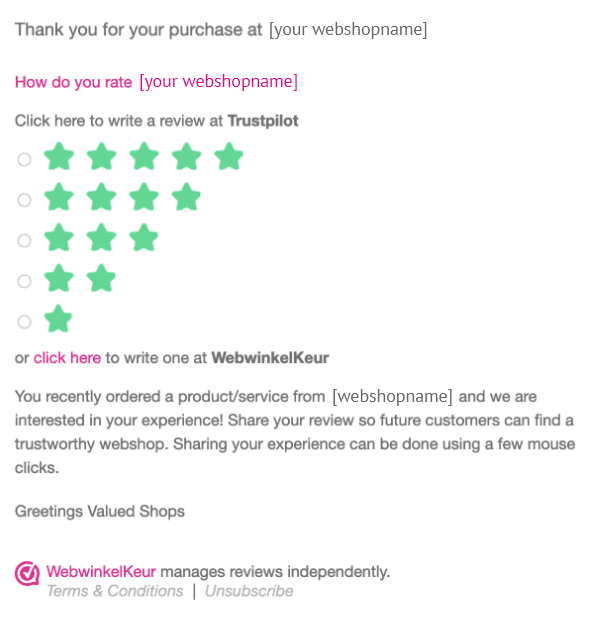 Stel nou dat alle tevreden klanten een review plaatsen bij partij A en alle ontevreden klanten een review plaatsen bij partij B. Potentiële klanten die vervolgens jouw bedrijf opzoeken, krijgen uiteenlopende scores te zien bij diverse reviewpartijen. Super verwarrend! Wie moeten ze dan nog geloven? Binnen no time hebben ze je webshop weggeklikt en zoeken ze elders verder.
