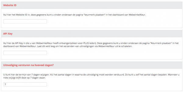 4. Vul je persoonlijke webwinkel ID + API code in. Deze gegevens vind je op de pagina Installatie > Wizard die beschikbaar is na inloggen op dashboard.webwinkelkeur.nl.