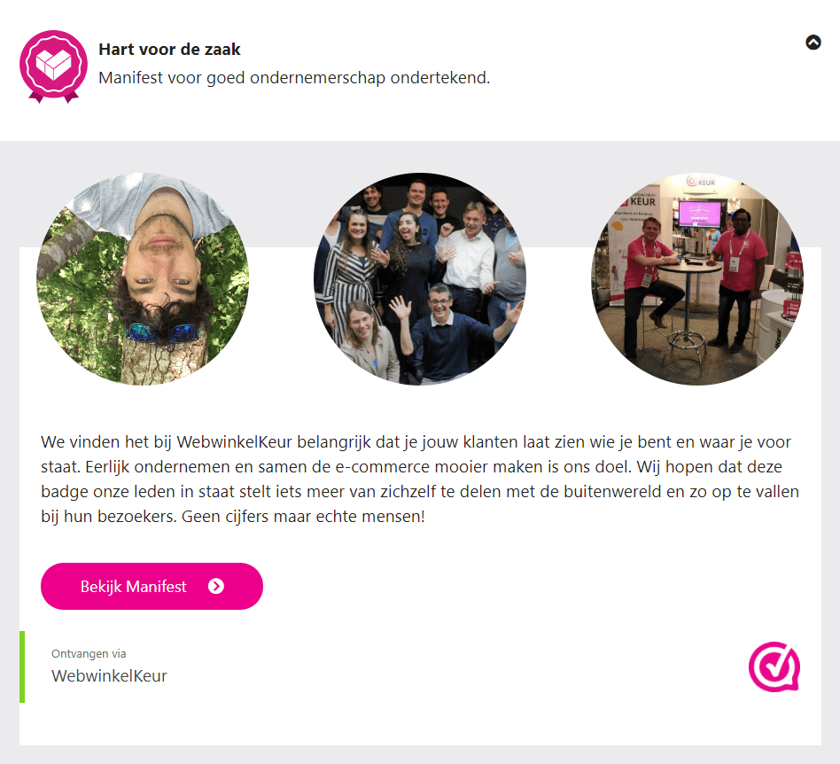 Het vrijspelen van deze badge is 'simpel'. Log eerst in op jouw dashboard , klik op 'Profiel' en daarna op 'Badges en zekerheden'. Vervolgens navigeer je naar 'Hart voor de zaak' en klikt op 'Teken het manifest' om het te ondertekenen. Nu komt het 'niet zo simpele' gedeelte; het naleven van de criteria van het manifest . Het manifest bevat punten die volgens ons staan voor goed en eerlijk ondernemerschap:- Eerlijk reviews verzamelen ; Positieve reviews zijn het leukste om te ontvangen, maar negatieve reviews horen er ook bij. Als ondernemer ontmoedig je deze negatieve reviews niet en beloon je niet alleen voor positieve reviews. Elke klant mag zijn review delen.