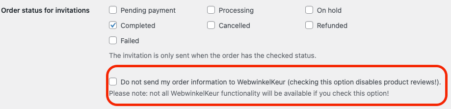Heb je de WebwinkelKeur plugin voor WooCommerce geïnstalleerd, dan vind je onder Instellingen > WebwinkelKeur de configuratie opties. Het is daarbij belangrijk dat er om gebruik te maken van Product Reviews geen vinkje staat bij de optie "Do not send my order information to WebwinkelKeur" (of Nederlandse vertaling).