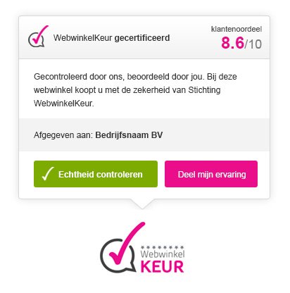 De WebwinkelKeur Javascript integratie zorgt ervoor dat klanten de echtheid van het keurmerk kunnen controleren en de klantervaringen kunnen lezen zonder je webshop te verlaten. Het voordeel hiervan is dat de conversie hoger zal zijn dan wanneer klanten je webwinkel zouden verlaten om de ervaringen op een externe website te bekijken. We raden je dus zeker aan de Javascript integratie te activeren.