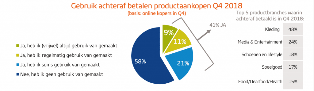 Middels het aanbieden van een achteraf betaalmethode kom je als ondernemer tegemoet aan de wet- en regelgeving op het gebied van online verkopen ; deze stelt namelijk dat je een consument niet mag verplichten het volledige bedrag vooraf (zoals bij iDEAL het geval is) te betalen. Met het opnemen van een achteraf betaaloplossing in jouw checkout tackle je dit probleem. Overigens is de creditcard, mits het bedrag pas wordt afgeschreven als de bestelling is verzonden en afgeleverd bij de consument, ook een adequate oplossing. Er zijn verschillende aanbieders van achteraf betaalmethoden voor webshops. Zo bieden partijen als Klarna, Afterpay, Billink en Buckaroo mogelijkheden om de klant eerste de producten te laten ontvangen en pas daarna te betalen. Gebaseerd op statistieken over het vierde kwartaal van 2018 (Q4) zegt liefst 41 procent van de consumenten weleens gebruik te hebben gemaakt van een achteraf betaalmethode. Vooral binnen de kledingbranche (eFashion) is achteraf betalen een veelgebruikte betaalmethode; klanten kunnen de producten eerst ontvangen en zien, en betalen daarna pas voor de items die ze ook daadwerkelijk houden. [caption id="attachment_78613" align="aligncenter" width="559"]