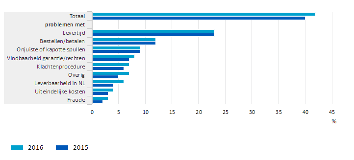 De voornaamste problemen waar consumenten tegen aan lopen is dat producten of diensten te laat worden geleverd. Drieëntwintig procent van de mensen die goederen of diensten via het internet kochten gaven dit aan. De tweede grootste probleem waar consumenten tegen aan lopen zijn technische problemen met bestellen of betalen (12%) via het internet. Ook zegt een deel van de shoppers (9%) dat ze het afgelopen jaar verkeerde of beschadigde producten hebben ontvangen. [caption id="attachment_63138" align="aligncenter" width="722"]