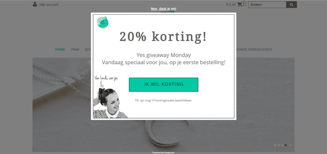 LinYoli creëert schaarste door te benoemen dat er nog maar 14 kortingscodes beschikbaar zijn. Deze pop-up kun je plaatsen in je webshop via de externe tool Shopboost.[/caption]