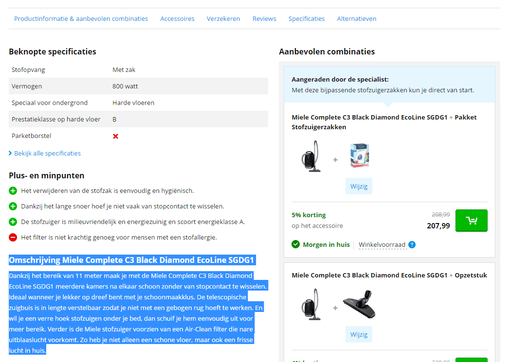 De productomschrijving van de stofzuiger Miele Complete C3 bij CoolBlue.[/caption]