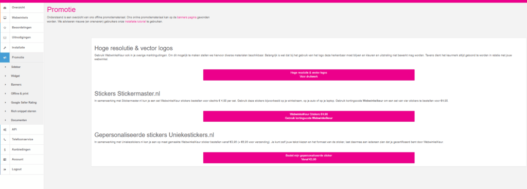 We werken daarbij samen met twee verschillende leden, namelijk Stickermaster & Uniekestickers. Via Stickermaster.nl is het mogelijk om een set bestaande uit vier WebwinkelKeur stickers te bestellen voor €4,98 inclusief verzendkosten. Via Uniekestickers betaal je €3,95 (ex. €6,95 verzending) voor 1 gepersonaliseerde sticker. De exacte details vind je via ons dashboard.