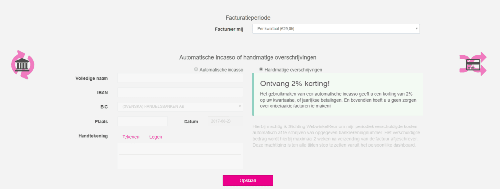 De machtiging kan eenvoudig worden gegeven via ons dashboard. Daarbij kan met de muis een “echte” handtekening gezet worden. De machtiging weer intrekken? Daar doen we ook niet moeilijk over, dat kan ook gewoon digitaal met een klik. Geef je ons een incasso machtiging, dan ontvang je automatisch 2% korting op elke komende factuur.