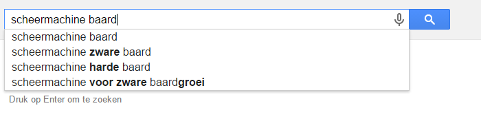 Wanneer we het algemene zoekgedrag van mensen onderzoeken binnen Google dan krijgen we natuurlijke inzichten over hoe mensen zoeken naar specifieke producten. We gaan nu inzoomen op het zoekgedrag van een consument die op zoek is naar een machine voor het scheren van gezichtshaar. De fictieve consument is bijvoorbeeld op zoek naar een scheerapparaat voor zijn baard. We zoeken nu in Google op de twee woorden 'scheermachine baard'. Op basis van deze twee woorden krijgen we nieuwe zoektermen van Google voorgeschoteld. Dit zijn alternatieve zoektermen waar mensen veel op zoeken binnen Google.