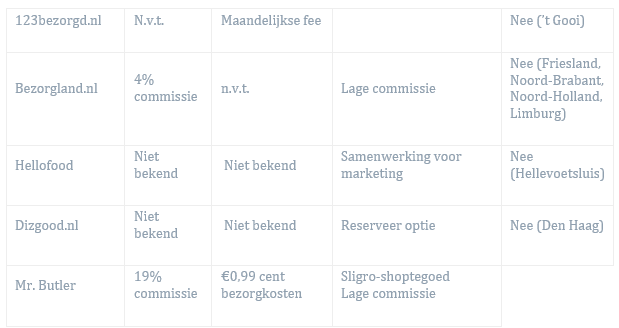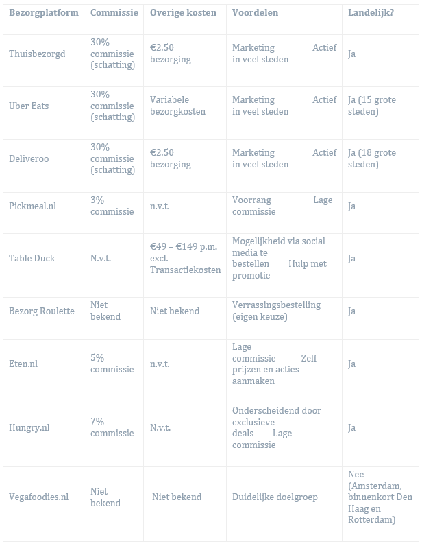 Tippr heeft een mooi overzicht gemaakt van een aantal verschillende platformen, de bijbehorende kosten en bezorggebied. Overweeg je een samenwerking aan te gaan met één van de partijen dan vind je hieronder een handige samenvatting.