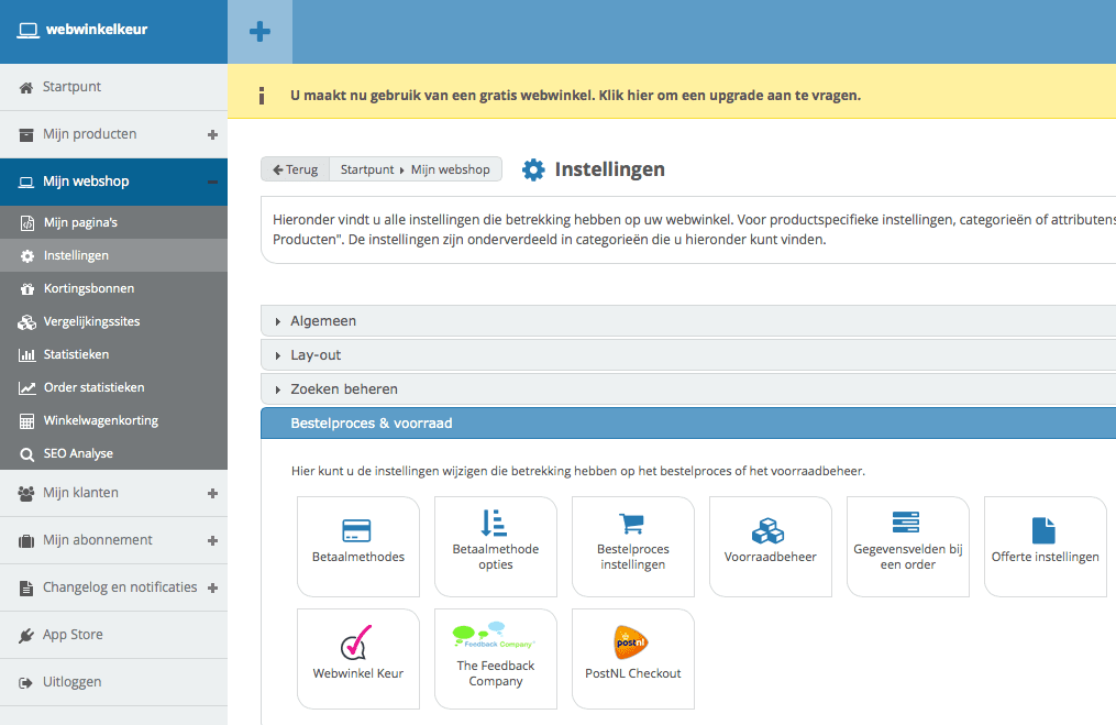 3. Ga naar Mijn webshop > Instellingen > Bestelproces & voorraad en klik daar op WebwinkelKeur.
