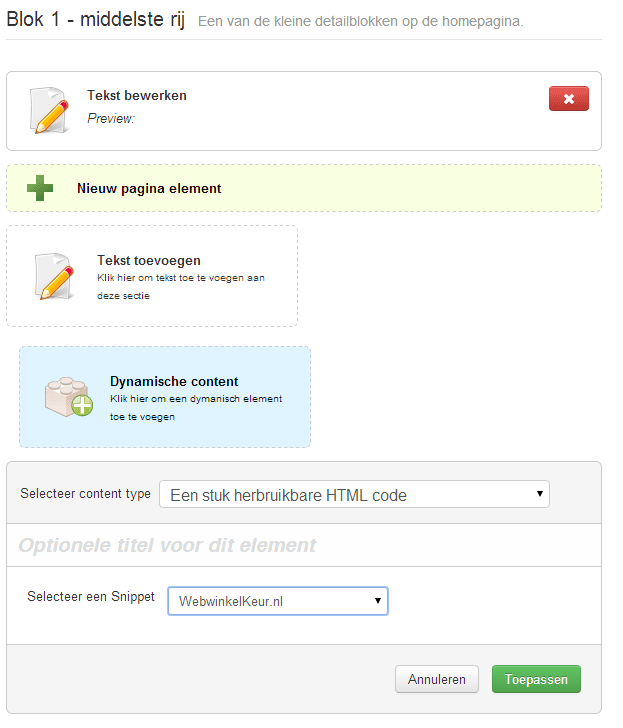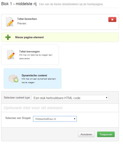 - Kies voor dynamische content en vervolgens voor de optie "Een stuk herbruikbare HTML" onder het kopje "Html snippets"