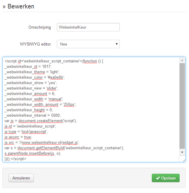 - Type bij Omschrijving "WebwinkelKeur" en kies bij de optie "WYSIWYG editor" voor "Nee".