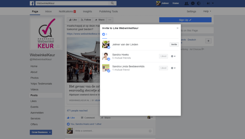 Ga naar je bedrijfspagina en vervolgens naar de content die je hierop hebt geplaatst. Klik vervolgens op het blauwe balkje waar in ons geval staat dat 'you, sandra hoeks and 1 other' het bericht hebben geliked. Wanneer je dit doet opent er zich een pop-up waar je de mogelijkheid hebt om de betreffende personen uit te nodigen tot het liken van de bedrijfspagina. Het grote voordeel hiervan is dat je nu mensen uitnodigt die 100% echt zijn, 100% je content liken en 100% gratis zijn.
