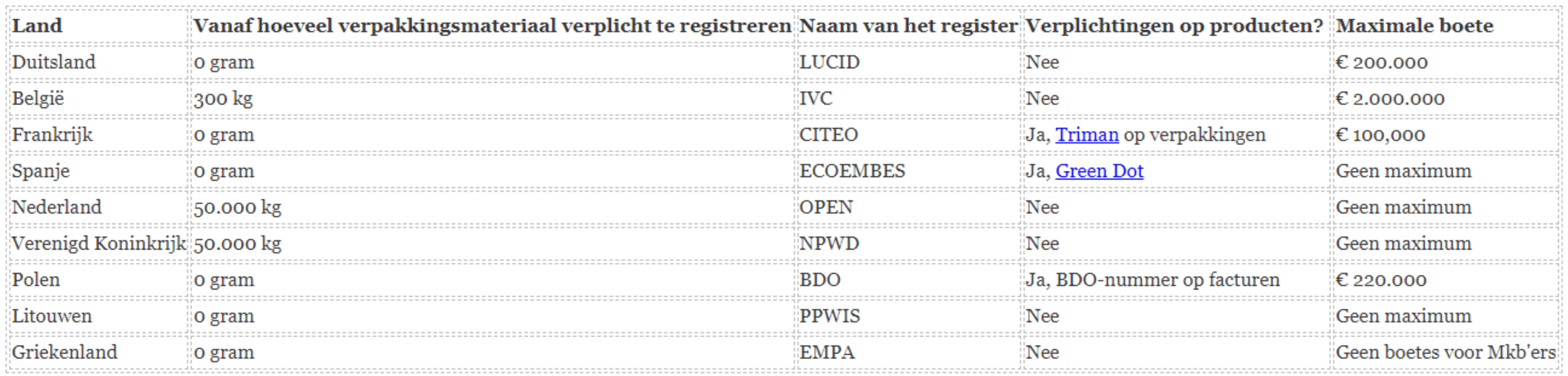 Ieder land heeft een eigen manier gekozen om deze wet te handhaven. In Nederland gaan we er vrij gemakkelijk mee om en hoef je als bedrijf pas vanaf 50.000 KG aan verpakkingsafval je te registreren. In Duitsland en Frankrijk is dit een heel ander verhaal. Vanaf de eerste gram verpakkingsmateriaal die je als bedrijf op de markt brengt, ben je verplicht om te zorgen voor recycling. Het gaat natuurlijk wat ver om zelf bij te houden of al je klanten de verpakking wel hergebruiken.