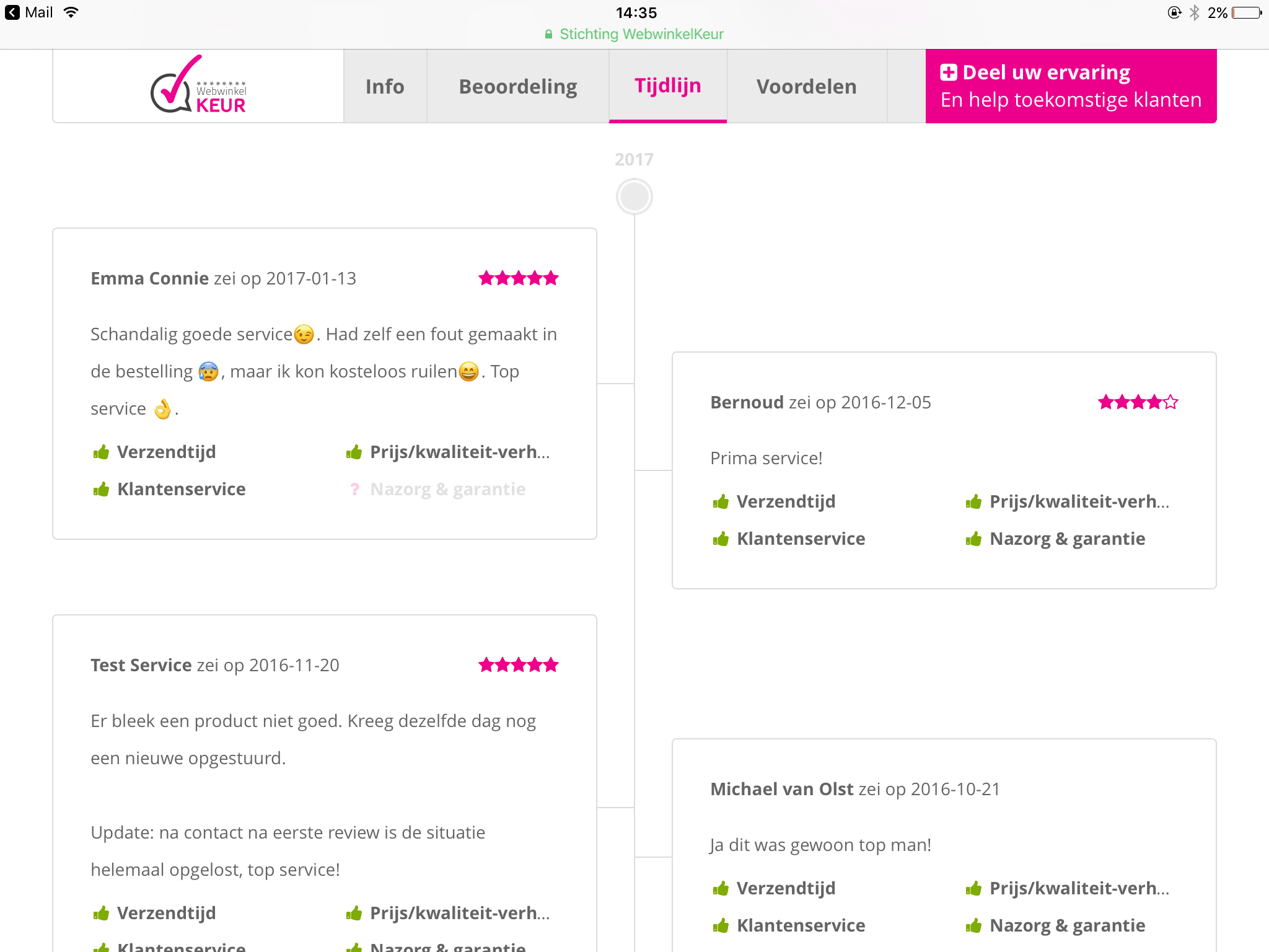 Het gebruik van emoticons in de recensies kan de enthousiasme van een klant nog duidelijker onderstrepen. Waardoor het in onze ogen een welkome uitbreiding is van onze reviewsysteem. Hoe ziet het er dan uit in ons systeem? Neem hiervoor als voorbeeld onderstaande recensie: