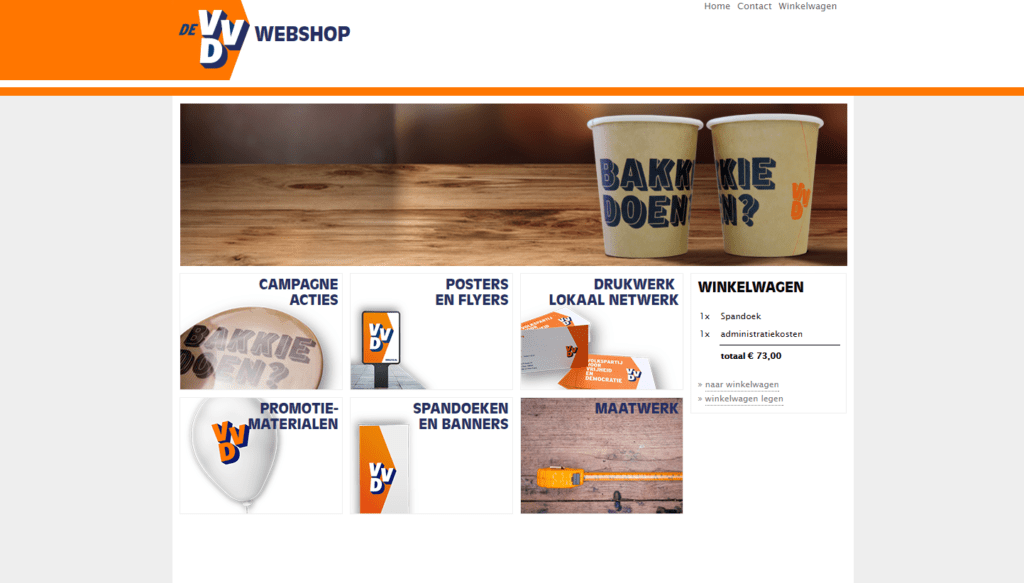 Wanneer we de webwinkel bekijken van de VVD dan komen we al gauw enkele fouten tegen. Zo zou ik een spandoek a 65,- kunnen kopen op de webwinkel van deze politieke partij. Omdat ik geen bedrijfsnaam hoef op te geven telt hierbij de consumentenwetgeving, c.q. mocht ik bij levering niet tevreden zijn over deze spandoek dan kan ik aanspraak maken op het herroepingsrecht. Het herroepingsrecht schrijft voor dat ik 14 dagen heb voor het aanmelden van het retourneren waarna ik na het aanmelden nogmaals een periode van 14 dagen heb voor het aanmelden van het retourneren. [caption id="attachment_63989" align="aligncenter" width="1024"]