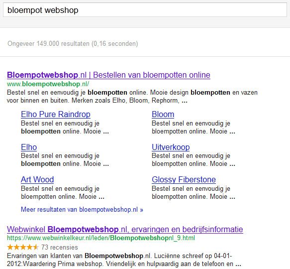 Natuurlijk zal de pagina met ervaringen niet altijd als tweede resultaat op een zoekterm verschijnen. Klanten zoeken echter vaak specifiek op ervaringen met je webwinkel. De zoekterm "ervaringen bloempotwebshop.nl" of "ervaringen met ervaringen bloempotwebshop.nl" zal dan ook zeker bij jouw webwinkel gebruikt worden. Wanneer je actief gebruik maakt van je ervaringenpagina zal deze dan ook zeker hoog opduiken in Google.