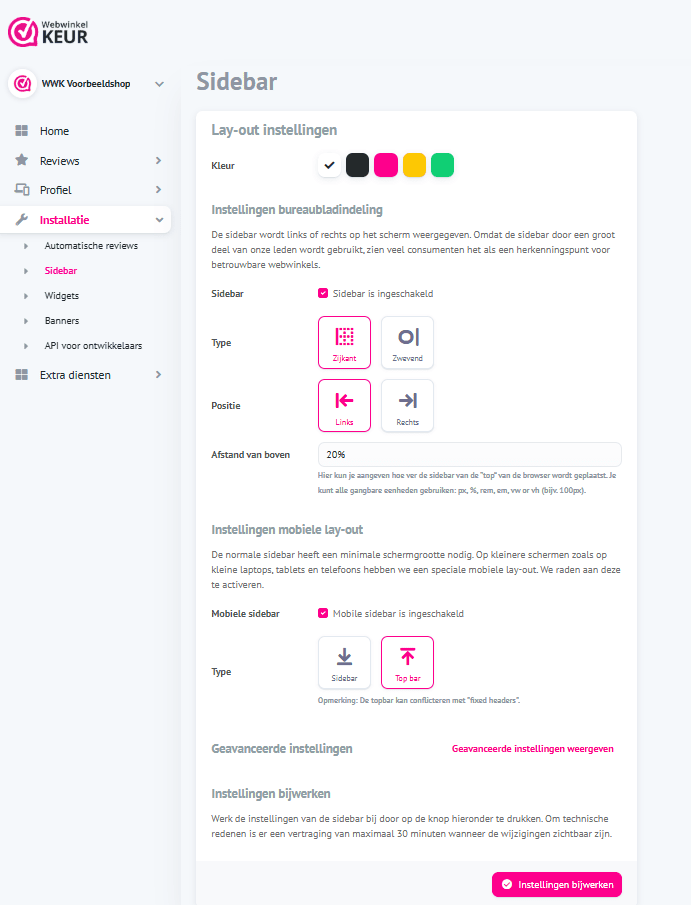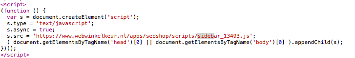 Let op: gebruik je Lightspeed? Dan dien je eerst de URL te openen die je in stap 1 vond (bijv. https://www.webwinkelkeur.nl/apps/seoshop/scripts/sidebar_13493.js). Het nummer in de URL is niet jouw ID maar een willekeurig nummer. In dat bestand vind je vervolgens dezelfde sidebar code met jouw instellingen.