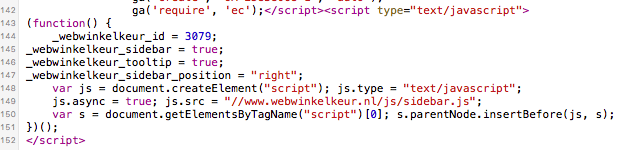 Je krijgt nu de code van de pagina te zien. Klik op de code en gebruik Ctrl + F om het zoekvenster te openen. Zoek vervolgens op "sidebar.js". Vind je een code zoals onderstaand, dan is de sidebar goed geïnstalleerd. Vind je geen code? Controleer dan in de module-instellingen van WebwinkelKeur binnen jouw webshop of de sidebar is ingeschakeld. Probeer eventueel de module opnieuw te installeren.