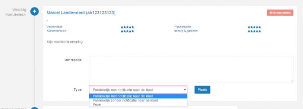 3. Typ hier je reactie onder een klantervaring. Bij de eerste optie kan dit met een notificatie naar de klant en bij de tweede optie kies je ervoor geen notificatie te versturen naar de klant.