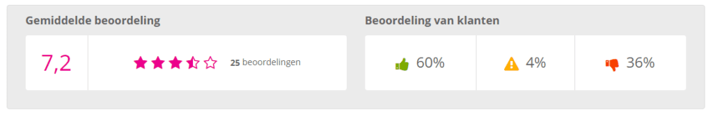 Op de ledenpagina worden percentages weergegeven. Het gaat dan op de percentages achter het groene duimpje (positief), oranje/gele uitroepteken (neutraal), de rode duimpje naar beneden (negatief). In bovenstaande voorbeeld is het positieve percentage 60%, Neutraal 4% en negatief 36%. We zien 4 en 5 sterren beoordelingen als positief, 3 sterren als neutraal en 1 en 2 sterren als negatief.