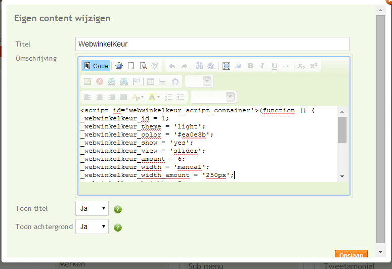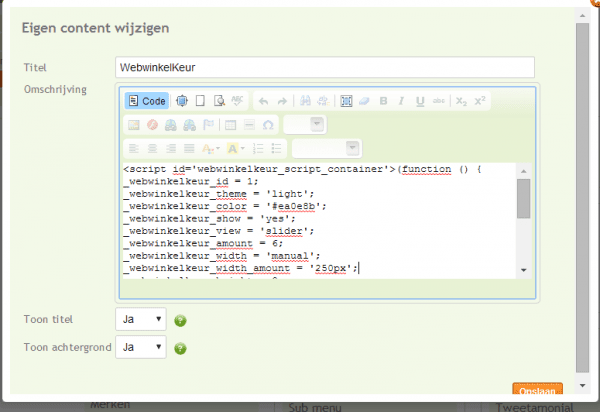 6. Typ bij titel 'WebwinkelKeur' en klik op de button 'Code'.