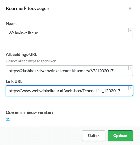 5. Klik op Opslaan om de keurmerkafbeelding aan je webwinkel toe te voegen.