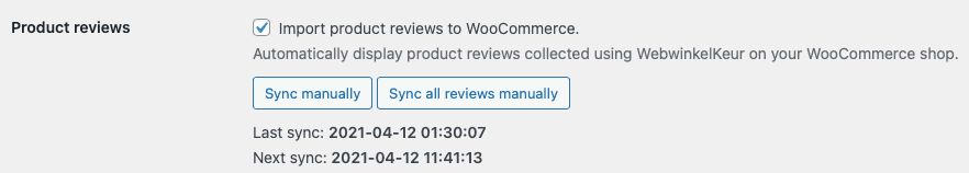 Nieuwe product reviews worden automatisch gesynchroniseerd met jouw WooCommerce webwinkel, hier kan wel enige vertraging in ontstaan. Werkt dit niet naar behoren, controleer dan of je onder Instellingen > WebwinkelKeur een vinkje hebt staan bij de optie "Import product reviews to WooCommerce".