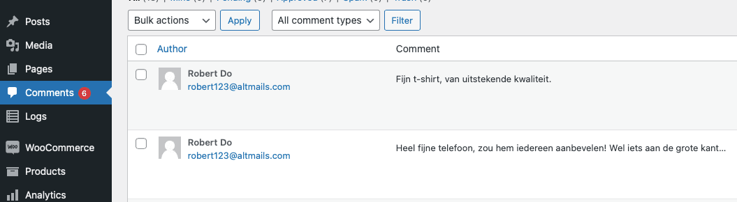 Bij een goed werkende synchronisatie verschijnen alle product reviews in je WooCommerce webshop onder Comments/Reacties.