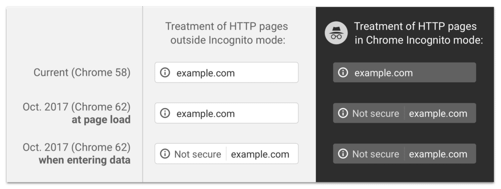 Vanaf Chrome versie 62 , verwacht in oktober dit jaar, worden:- de huidige 'i' waarschuwing bij onbeveiligde invulvelden uitgebreid met de meer opvallende melding 'Not Secure'.