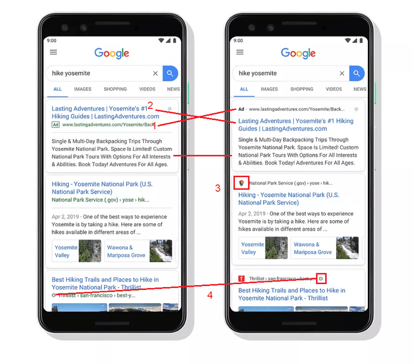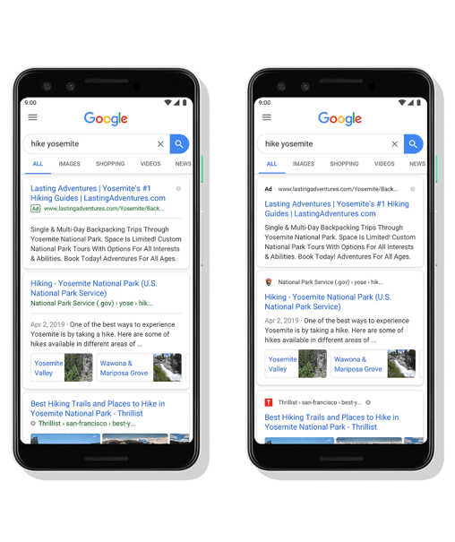 - Advertenties; Voorheen waren de advertenties zichtbaar als groen omrande tekst met daarin advertentie. Dit blok stond naast de URL. Deze stond onder de titel. Nu is deze hele blok helemaal naar boven gezet. Verder is ook de tekst advertentie niet meer groen omrand, maar alleen maar dikgedrukt en zwart. Gevolgen; Dit kan resulteren in meer kliks omdat advertenties steeds minder duidelijk zichtbaar worden.