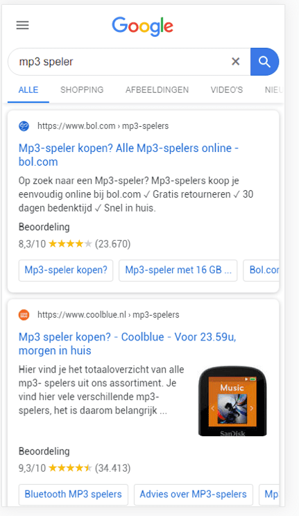 Controleer eerst even of je zelf al een favicon hebt. Heb je deze niet, maak er dan een aan volgens de richtlijnen van Google. Doe je dit niet, dan komt de standaard wereldbol hiervoor in de plaats. Zorg daarna dat je een goede en duidelijke favicon upload naar je website. Zoals je hieronder kunt zien hebben Coolblue en bol.com nog wat te doen ;-)