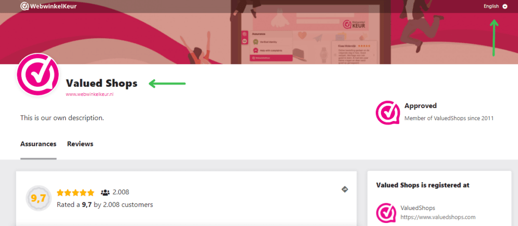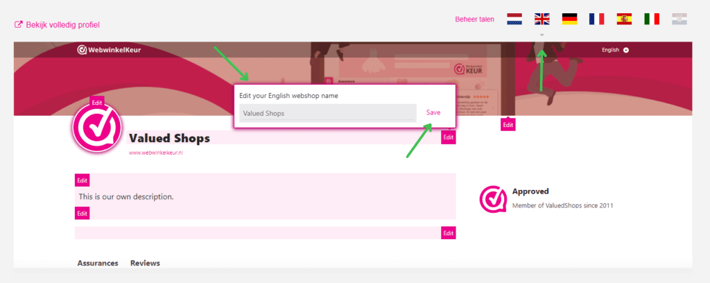 Wanneer je daarna in je webshop naar je WebwinkelKeur-ledenpagina gaat, zie je binnen een paar minuten de nieuwe naam verschijnen. Hiervoor moet je natuurlijk wel even overschakelen naar de juiste taal. Zo ziet het er dan uit op je ledenpagina: