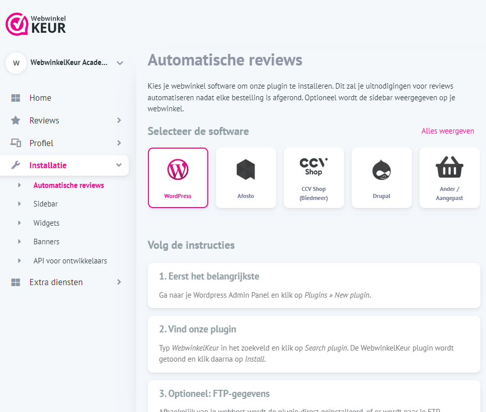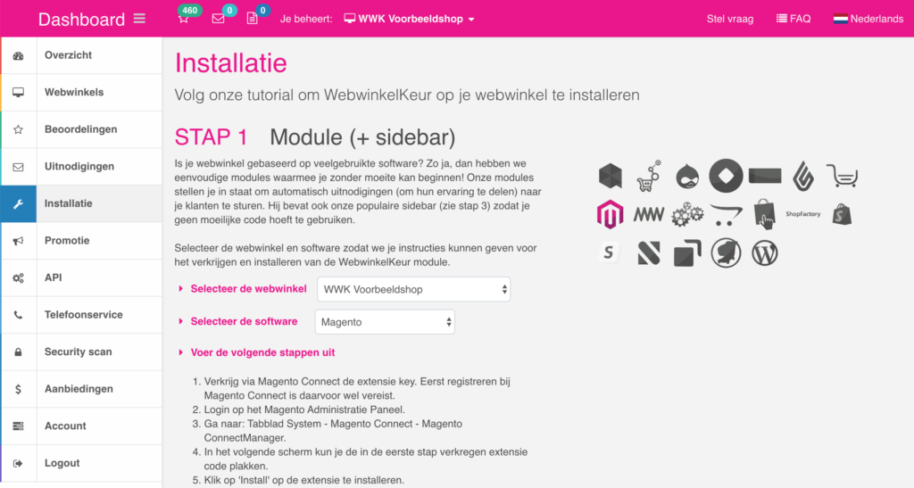 Als je na het inloggen op 'Installatie' klikt, dan vind je daar stap-voor-stap persoonlijke instructies om WebwinkelKeur te installeren. Vergeet ook niet de tips voor de juiste plaatsing van je keurmerk te lezen