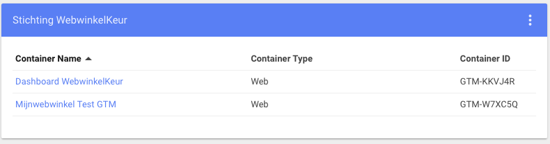 - Log in op je Google Tag Manager account en klik op de container die gebruikt wordt binnen jouw webshop.