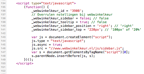Let op: gebruik je Lightspeed? Dan dien je eerst de URL te openen die je in stap 1 vond (bijv. https://www.webwinkelkeur.nl/apps/seoshop/scripts/sidebar_13493.js). Het nummer in de URL is niet jouw ID maar een willekeurig nummer. In dat bestand vind je vervolgens dezelfde sidebar code met jouw instellingen.