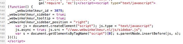 Je krijgt nu de code van de pagina te zien. Klik op de code en gebruik Ctrl + F om het zoekvenster te openen. Zoek vervolgens op "sidebar.js". Vind je een code zoals onderstaand, dan is de sidebar goed geïnstalleerd. Vind je geen code? Controleer dan in de module-instellingen van WebwinkelKeur binnen jouw webshop of de sidebar is ingeschakeld. Probeer eventueel de module opnieuw te installeren.