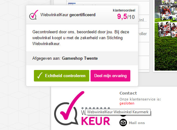 Het echtheidscertificaat betekent dat wanneer je met de muis over het keurmerk heen gaat er een pop-up verschijnt waarin te zien is dat de webwinkel gecertificeerd is. Dit kan van toepassing zijn op enkel ons logo of een banner zoals hieronder: