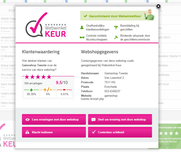 Een geldig keurmerk van WebwinkelKeur is daarnaast vaak klikbaar. Na het klikken komt er een pop-up naar voren waarin onder andere de zekerheden en badges & reviews te lezen zijn.